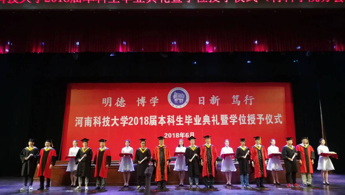 随后,校领导为带父求学、播撒正能量的“孝心男孩”赵德龙及其父亲颁发证书并致以真挚祝福;毕业生代表刘萌萌通过回顾大学四年的难忘时光,感谢老师的谆谆教诲和母校的培养教育,并祝愿母校的明天更加灿烂;教师代表刘伟深情致辞,一字一句中透漏着不舍和对学生们的衷心祝福。“滔滔黄河,巍巍嵩岳,桃李芬芳,根在河洛。我们日新笃行,我们明德博学,我们励志图强,我们成才报国。”熟悉的歌声再次响在耳畔,屏幕上重复播放着属于2018届毕业生的暖心视频,一张张如花的笑颜充满对母校的感恩和不舍。毕业典礼也至此圆满结束。