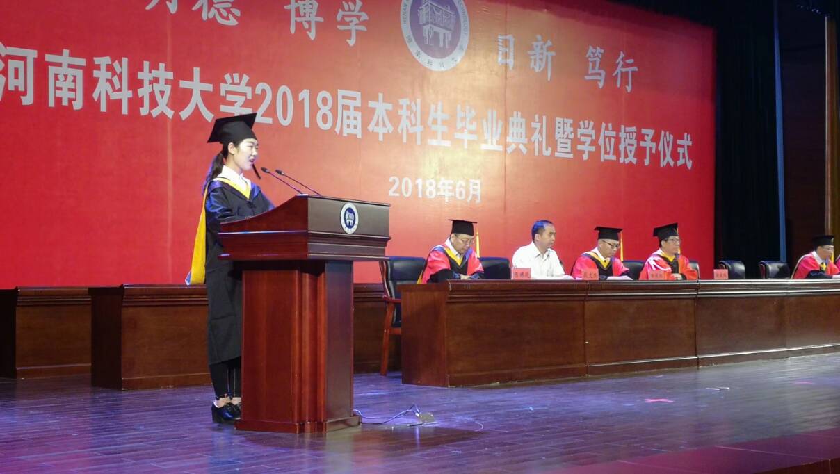 毕业典礼在庄严的国歌声中拉开帷幕。在同学们的热烈掌声中,材料学院副院长田保红教授宣读《河南科技大学关于2018届毕业生资格审查情况及学位授予的决定》,段文杰副书记宣读《河南科技大学关于表彰2018届优秀本科毕业生的决定》。